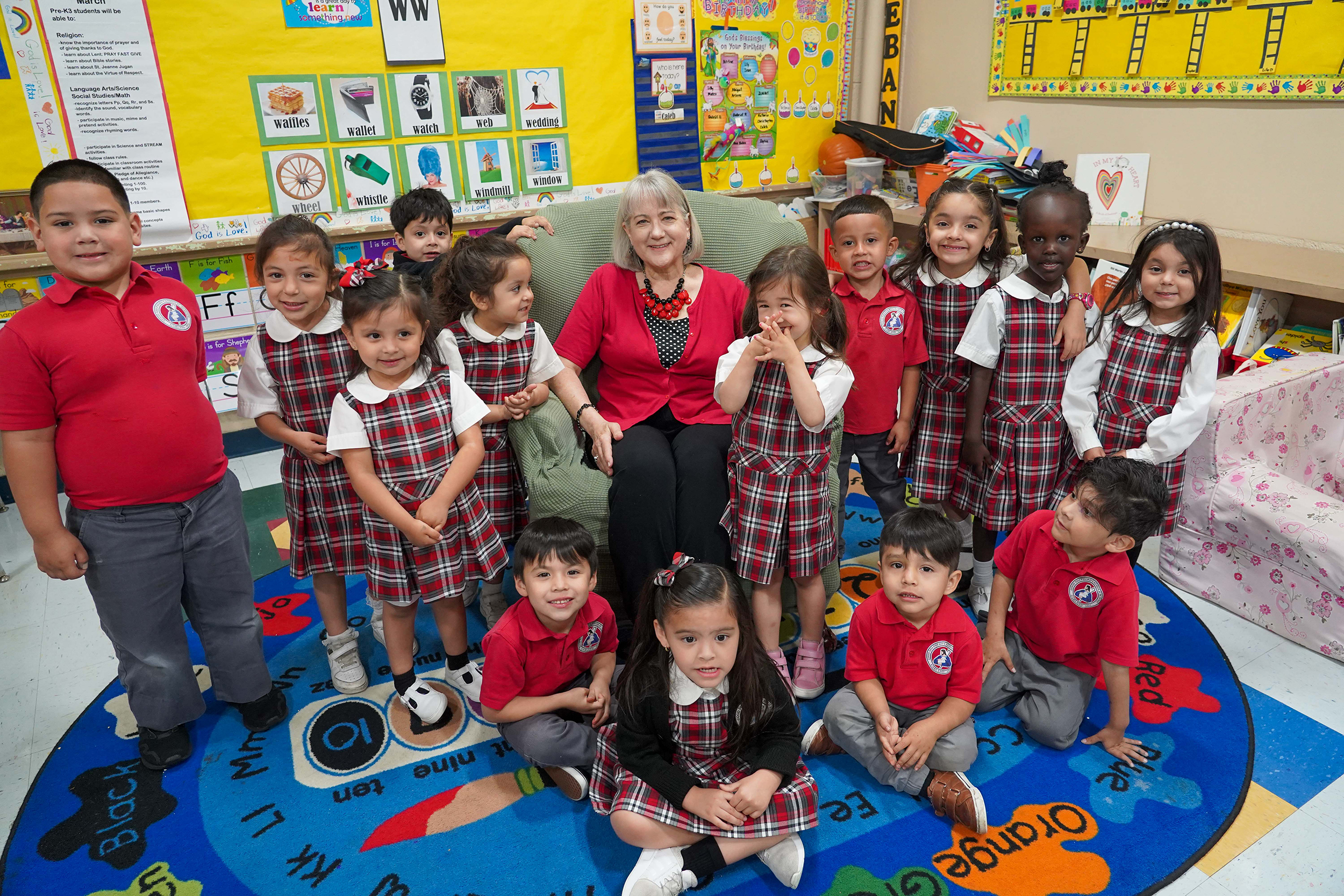 Gail Richardson-Bassett, seated center, is retiring in June as the principal of Good Shepherd Catholic School in Garland. Richardson-Bassett has been with the school for 44 years, serving as a teacher, assistant principal and principal. (Michael Gresham/The Texas Catholic)