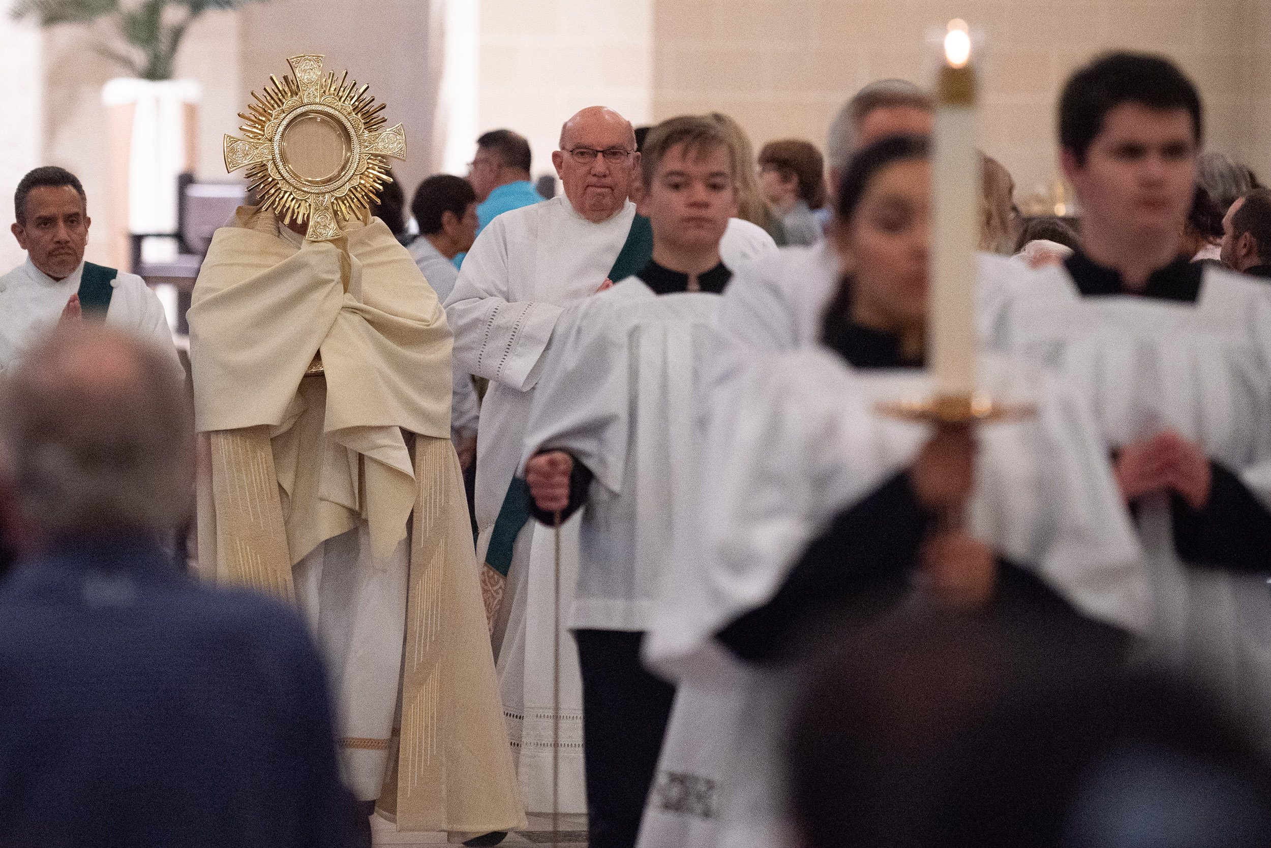 Father Rudy Garcia, pastor of St. Francis of Assisi Catholic Church, carries a monstrance as he participates in a special procession for National Eucharistic Revival on June 14 at the Frisco parish. (Ben Torres/Special Contributor)