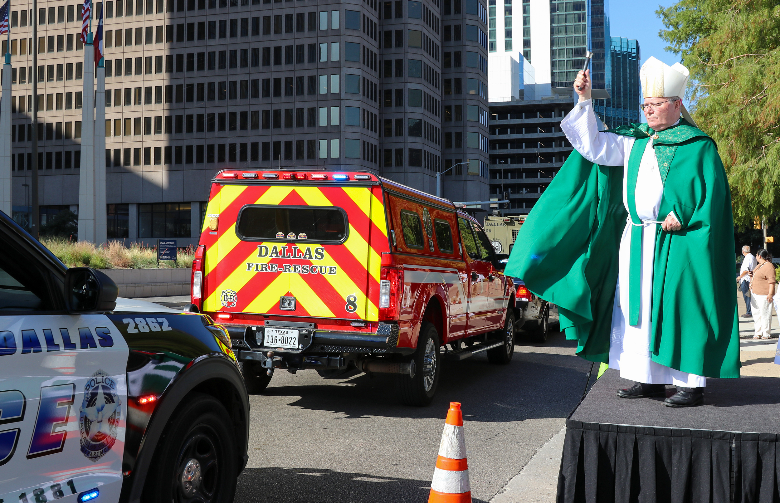 Prior to the celebration of the Blue Mass, Bishop Burns stood upon a stage outside the cathedral, blessing a procession down Ross Avenue of police cruisers, fire trucks, emergency vehicles and even Little Dude, a mustang ridden by a member of the Dallas County Sheriff’s Office’s mounted posse.