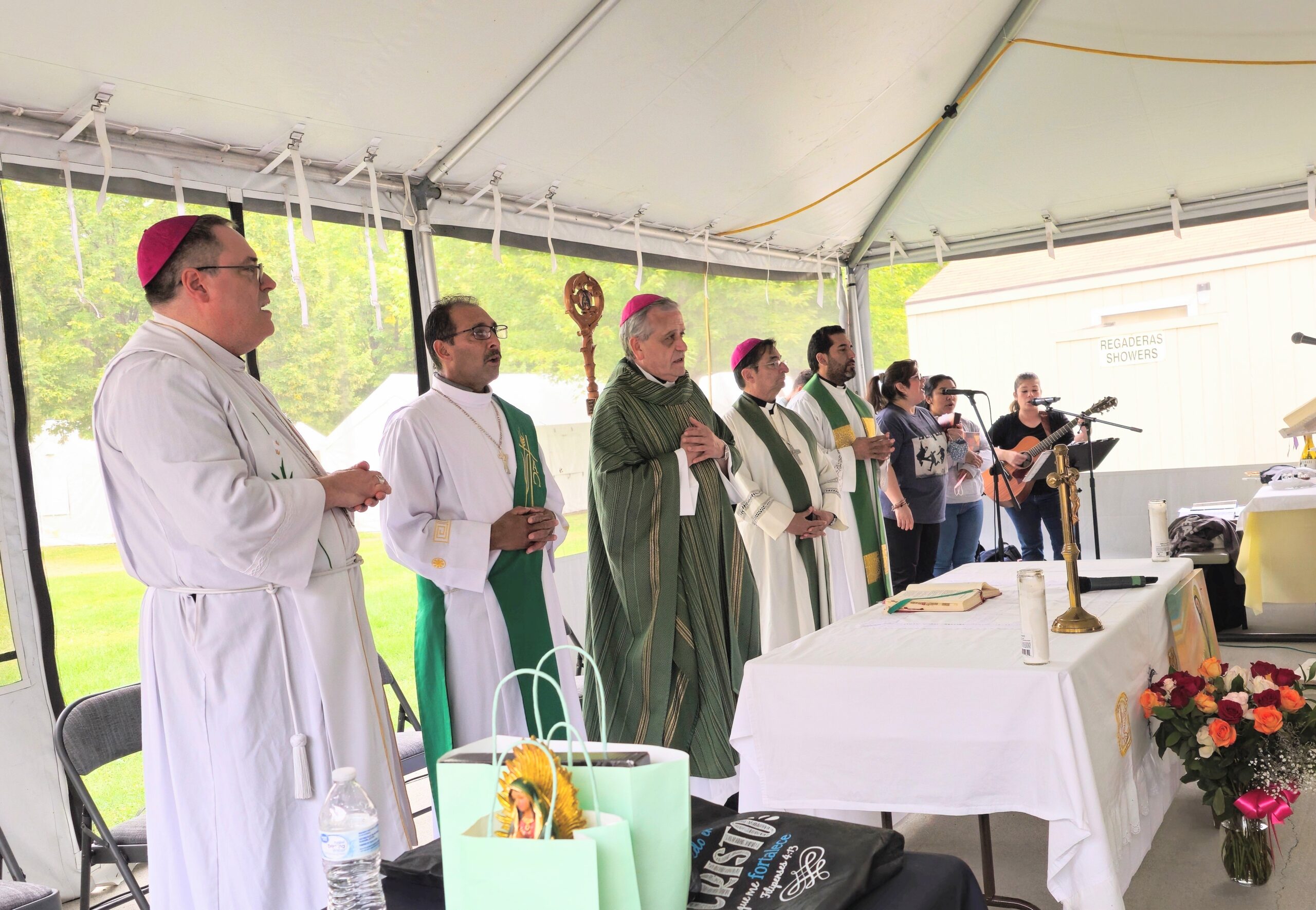 The last stop of the pastoral visit was a migrant camp in Monitor, near Wenatchee, where the three bishops present — Bishop Tyson, and Bishop Eusebio L. Elizondo and Bishop Frank R. Schuster, both auxiliary bishops of the Archdiocese of Seattle — concelebrated Mass and the workers shared a feast with the delegation.