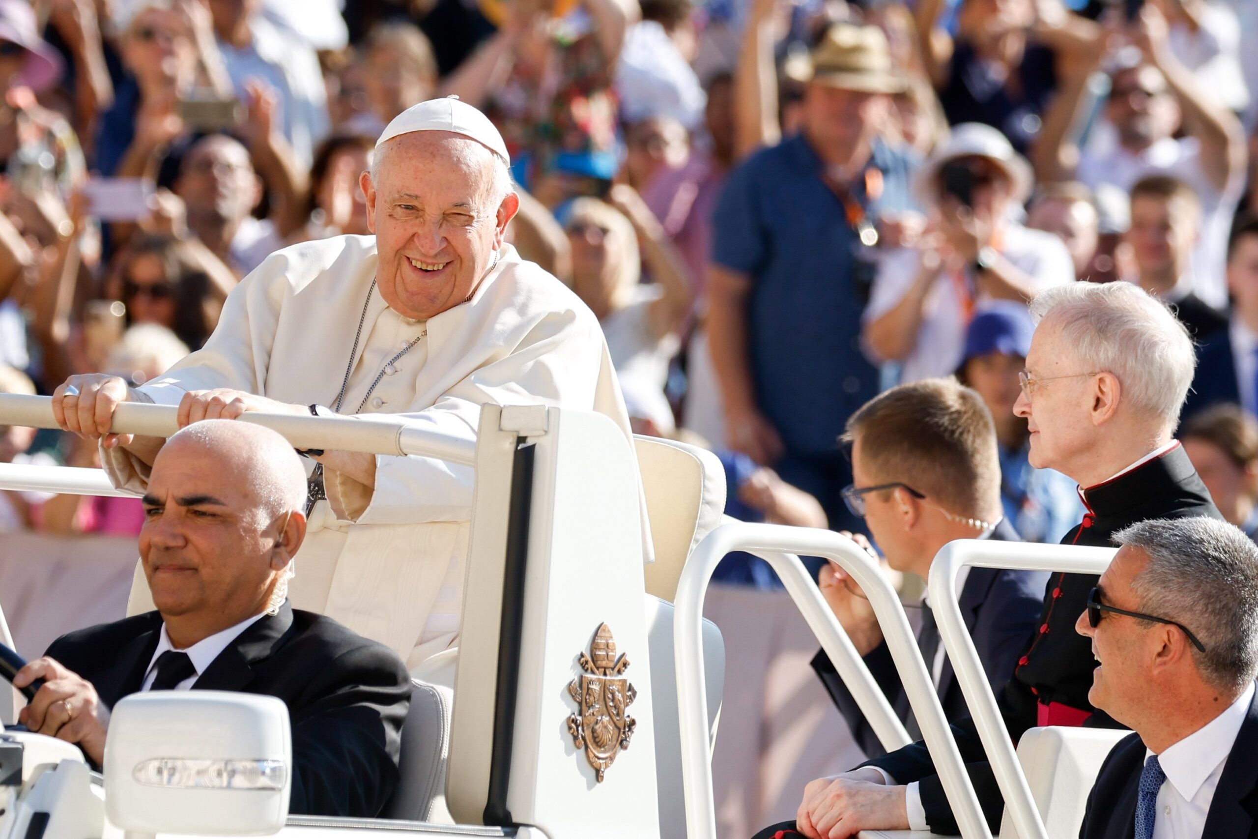 Pope Francis smiles from the popemobile as he rides around St. Peter’s Square at the Vatican before his weekly general audience Sept. 6, 2023. (CNS photo/Lola Gomez)