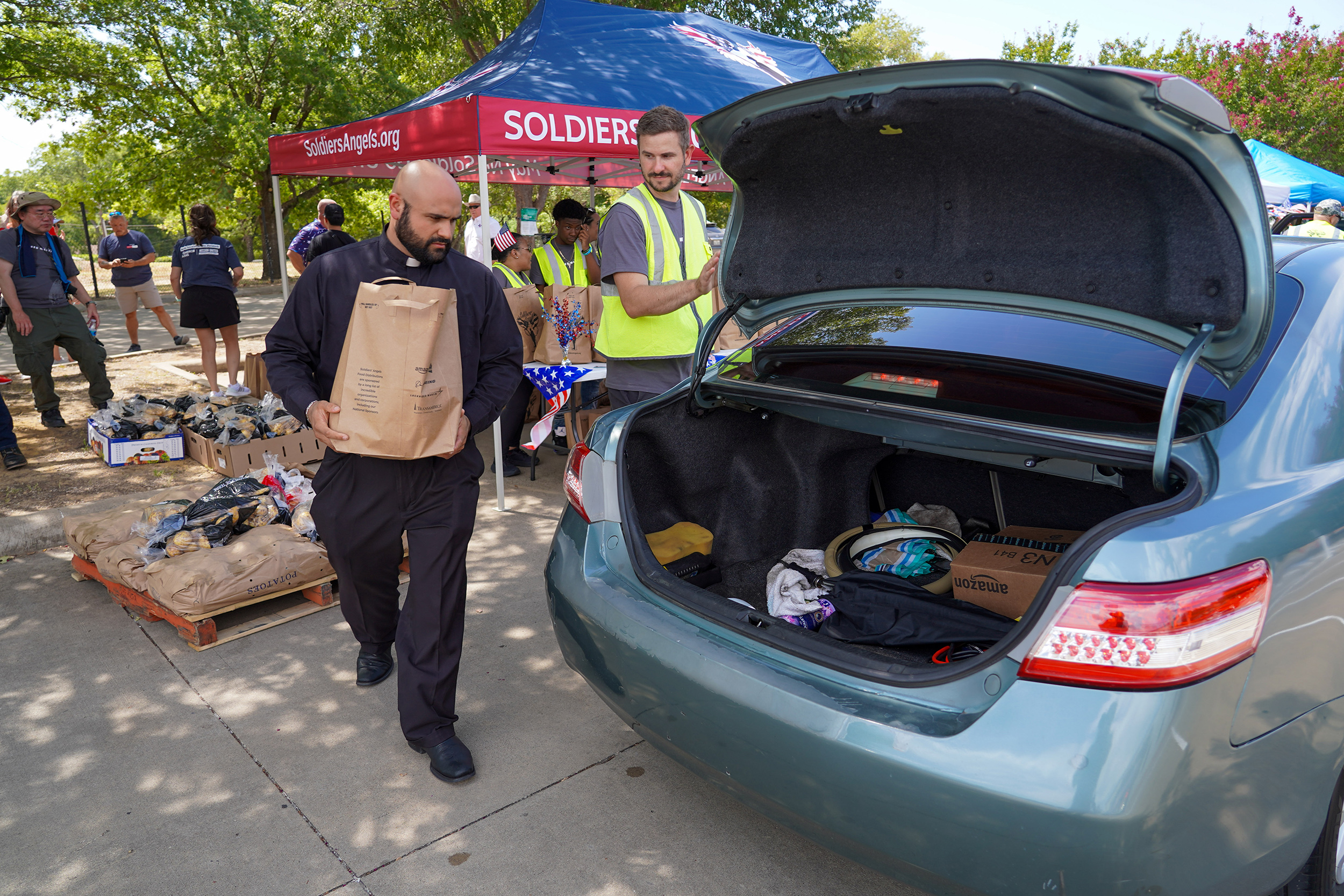 Father Elmer Herrera-Guzman carries a bag of non-perishable supplies to a vehicle during a food distribution event for Dallas-area veterans and military personnel on Sept. 8 at Holy Cross Catholic Church. The event was coordinated by Soldiers’ Angels in cooperation with the Oak Cliff parish and the North Texas Food Bank. Find more images from the event in the photo gallery at devsite4.lucindigital.com.