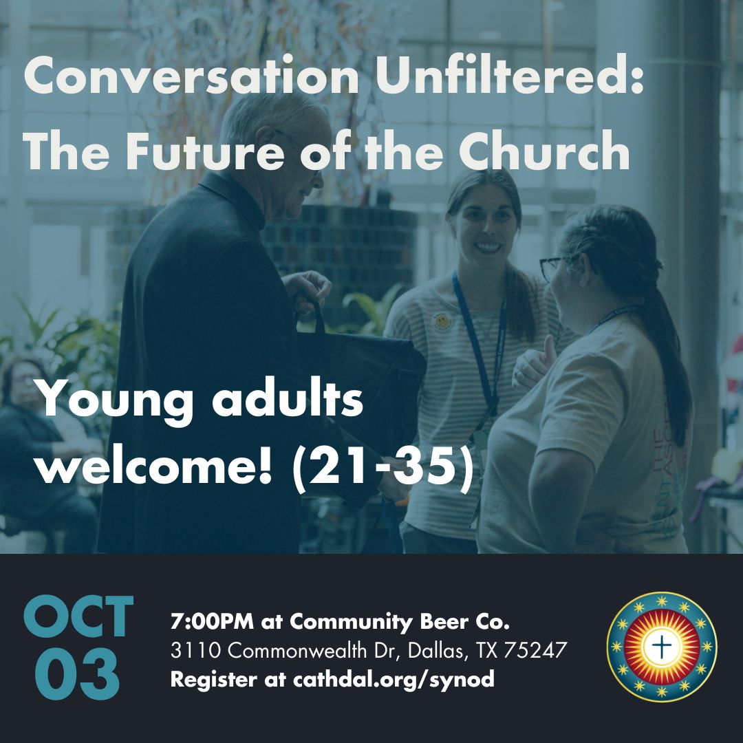 A special Diocese of Dallas synod listening session for Young Adults is coming up on Oct. 3. The intention of the synod listening session is to hear the voices of the Church—this one particularly young adults between the ages of 21-35––who are not typically heard, in order to address their needs and invite them to join our community.