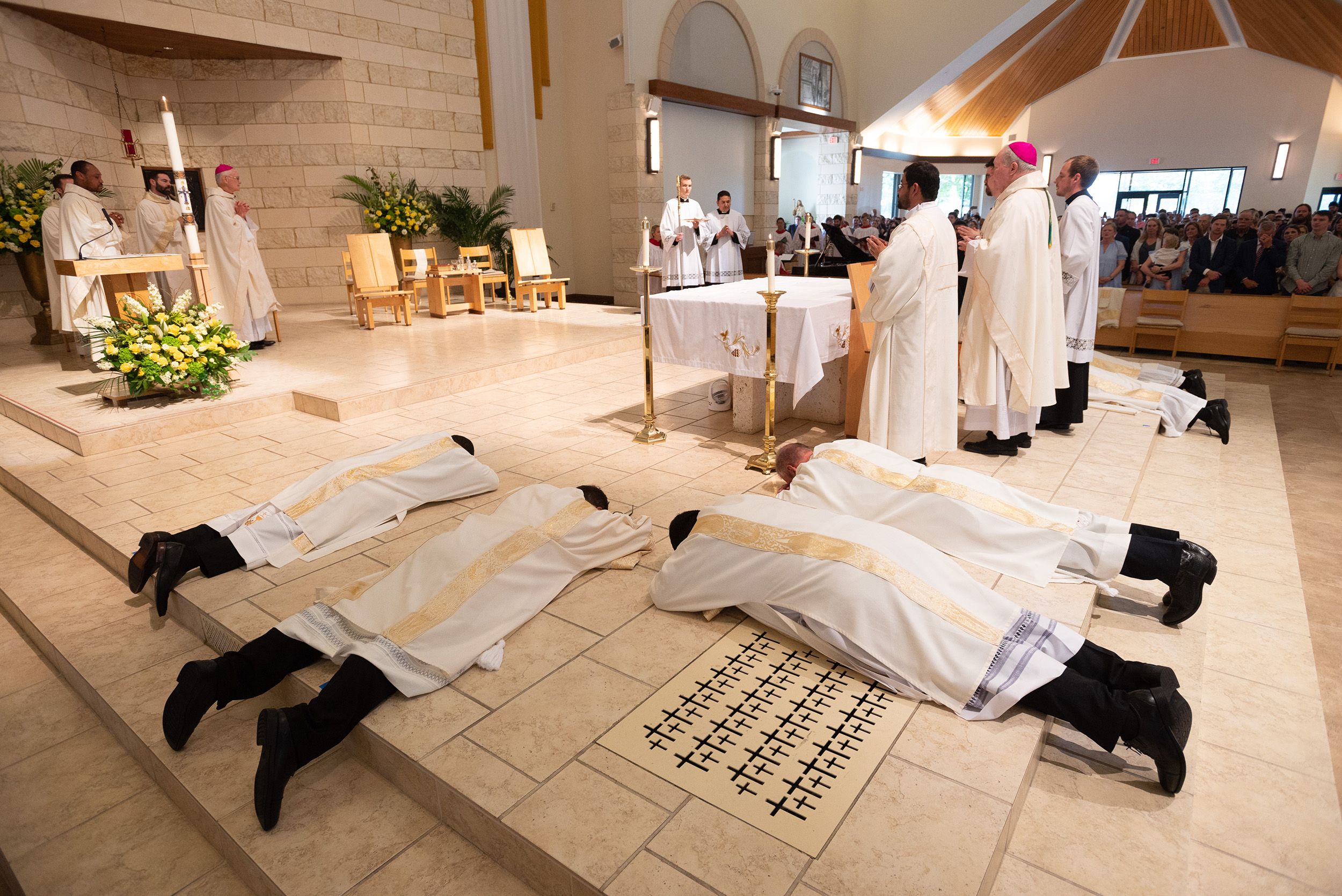 Eight men being ordained to the priesthood for the Diocese of Dallas lay prostrate during the celebration of a Mass by Bishop Edward J. Burns for their presbyteral ordination on May 20, 2023, at St. Jude Catholic Church in Allen. (Ben Torres/Special Contributor)