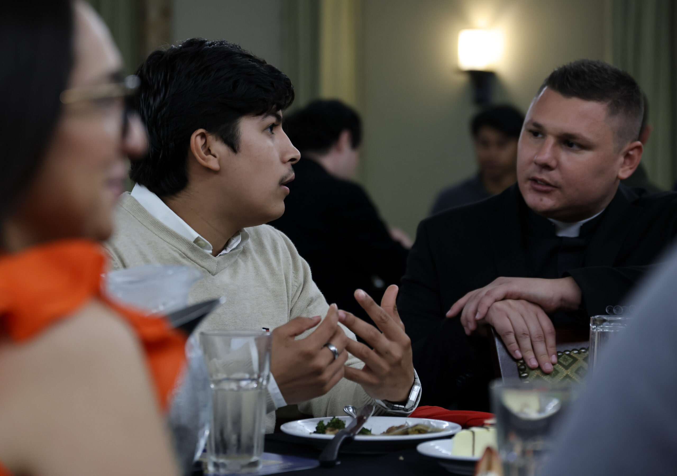 Father Mark Garrett, right, the Diocese of Dallas director of vocations, listens as Jonathan Estrada-Beiza talks during the St. Andrew’s Dinner at Holy Trinity Seminary in Irving on Nov. 7. (Michael Gresham/The Texas Catholic)