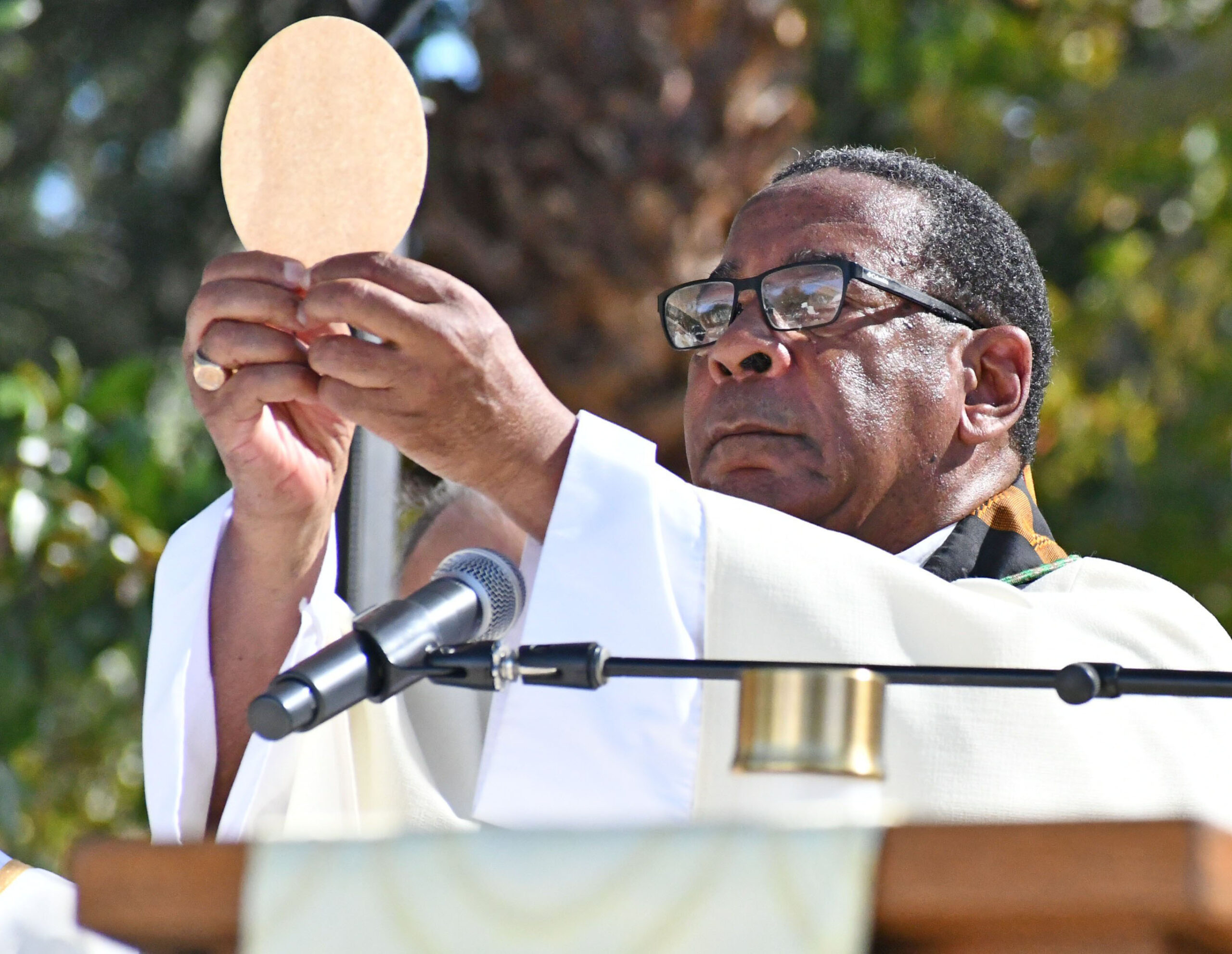 Retired Bishop J. Terry Steib of Memphis, Tenn., raises the host as he celebrates a centennial Mass for St. Augustine Seminary in Bay St. Louis, Miss., Oct. 29, 2023. It was the first seminary founded in the U.S. to train Black men for the priesthood. Assisting the bishop are Deacons Clay Kuykendall from St. Pius X Parish in Beaumont, Texas, and Earl Saucier from Sacred Heart Parish in Dedeaux, Miss. (OSV News photo/Juliana Skelton, Gulf Pine Catholic)