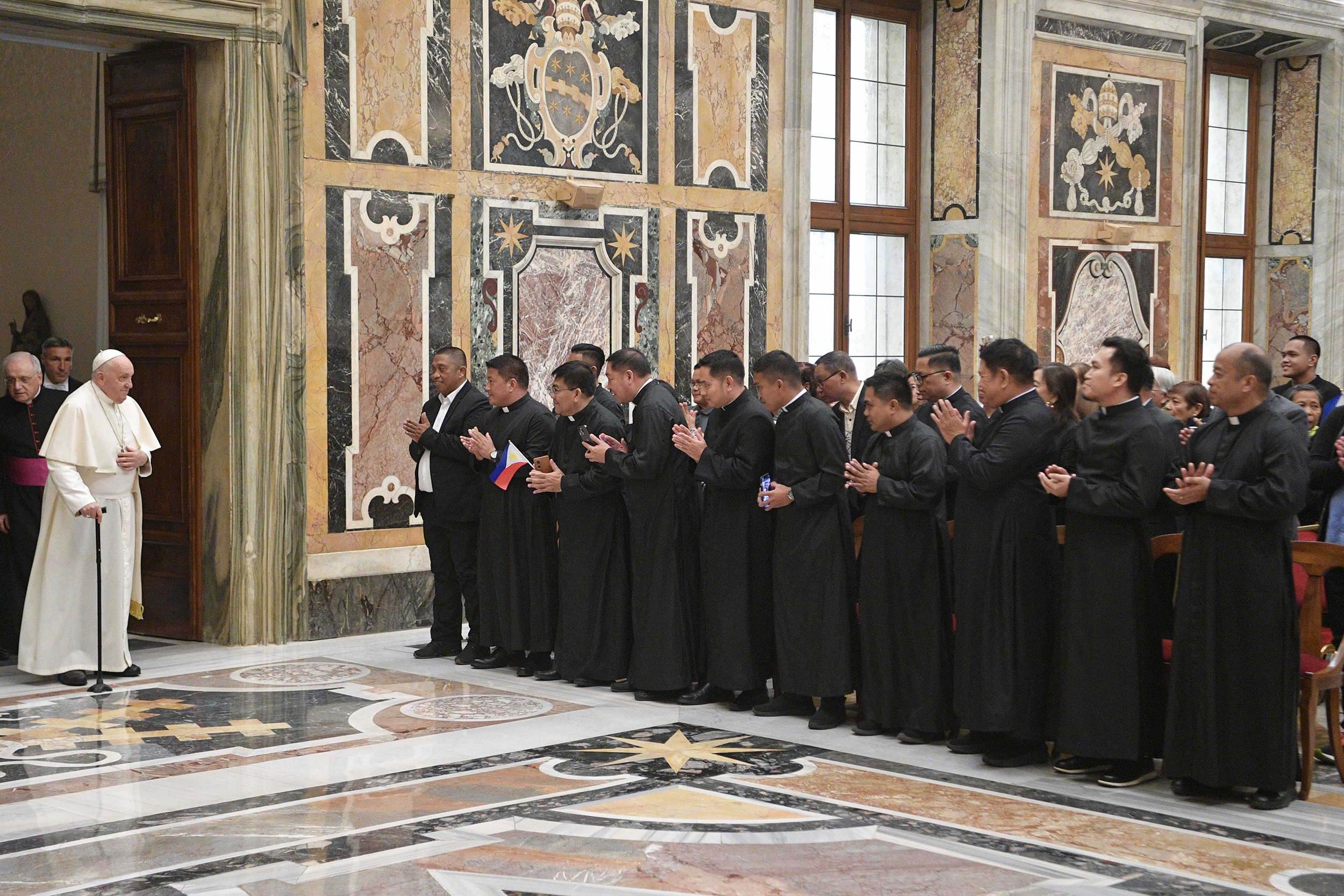 Pope Francis meets pilgrims from the Archdiocese of Ozamiz, Philippines, who were visiting the Vatican and Marian shrines in Europe Nov. 17, 2023, in the Apostolic Palace at the Vatican. (CNS photo/Vatican Media)