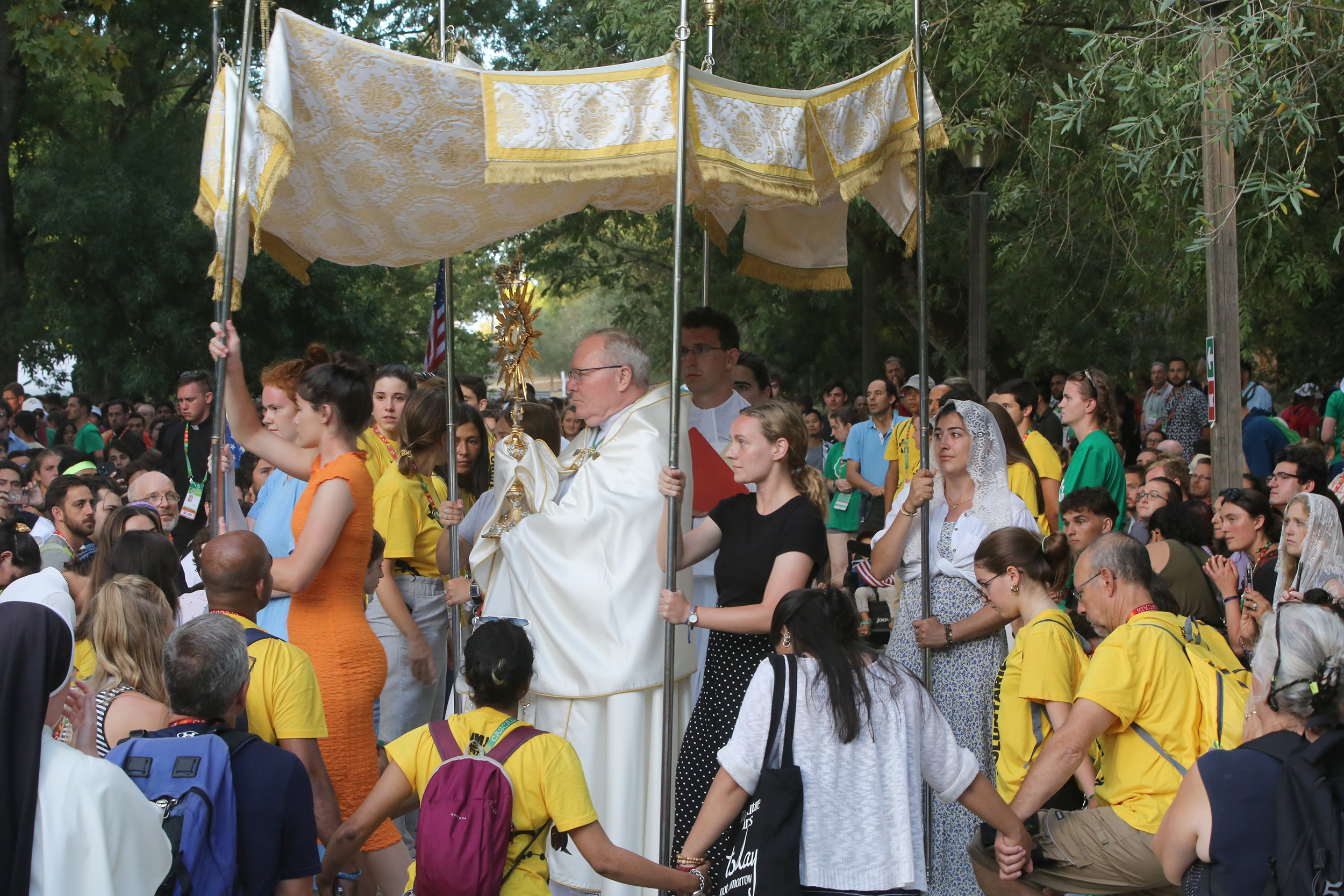 Bishop Edward J. Burns of Dallas carries the monstrance in a procession during an Aug. 2, 2023, gathering for U.S. pilgrims at World Youth Day at Quintas das Conchas e dos Lilases Park in Lisbon, Portugal. (OSV News photo/Bob Roller)