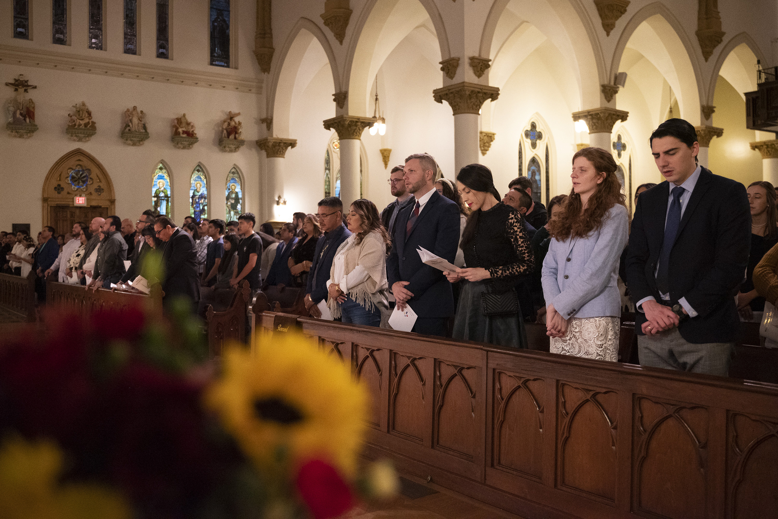Married couples stand for prayer at the start of a special Mass celebrated by Bishop Edward J. Burns to celebrate the Diocesan Newlywed Mass at the National Shrine Cathedral of Our Lady of Guadalupe on Dec. 2, 2023. (Ben Torres/Special Contributor)