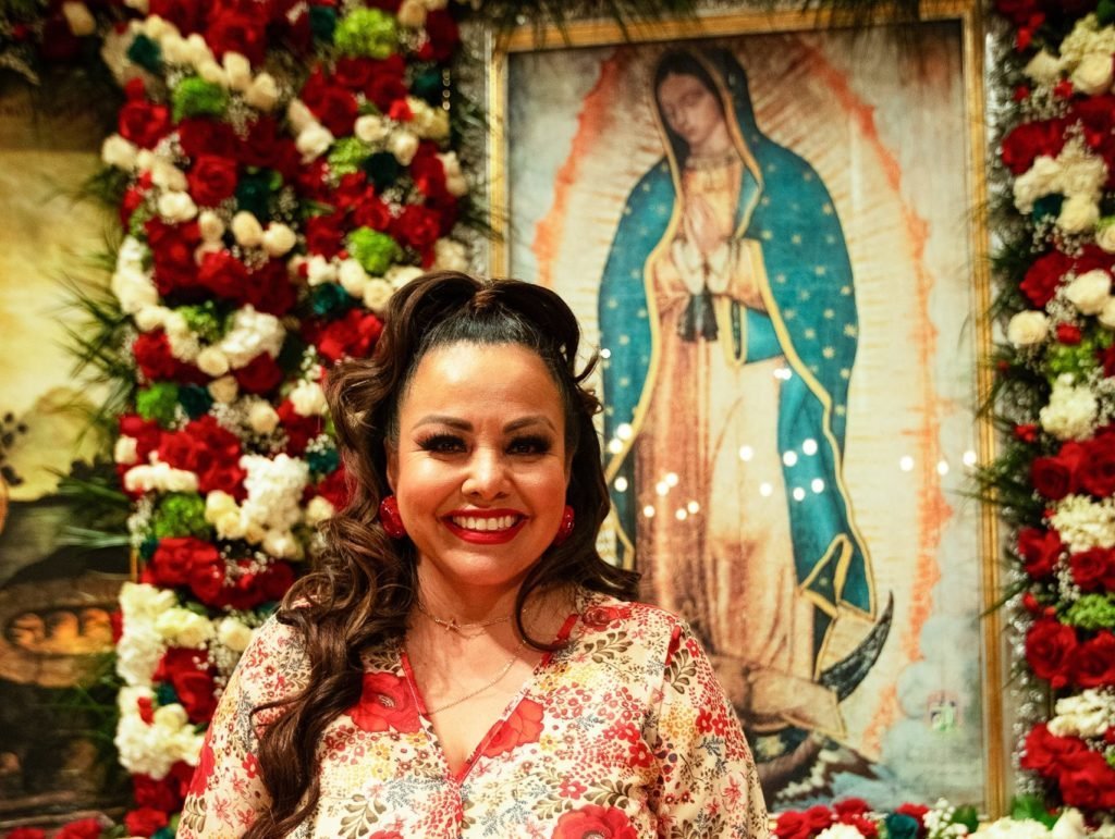 Una radiante Rosy Oros ante una imagen de Nuestra Señora de Guadalupe en la Catedral de Nuestra Señora de los Ángeles de Los Ángeles durante la celebración anual de “Las Mañanitas” el 11 y 12 de diciembre de 2023, en honor a la festividad de Nuestra Señora. La cantante atribuye su sanación de una infección mortal a la intercesión de Nuestra Señora de Guadalupe en 2018. (Foto OSV News/Victor Alemán, Angelus News)