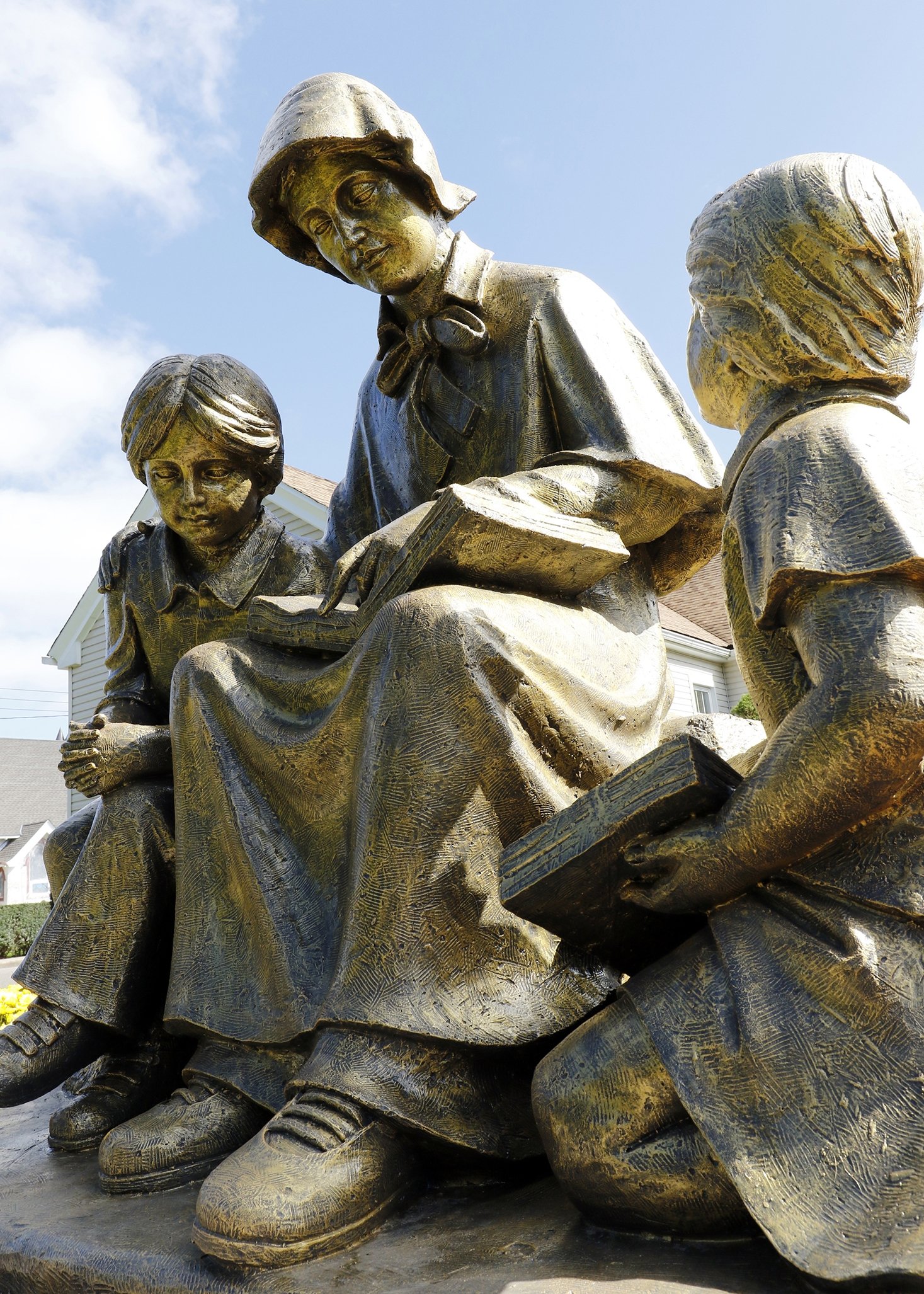 St. Elizabeth Ann Seton, patroness of Catholic schools in the U.S., is depicted instructing schoolchildren in a sculpture seen in front of Sts. Philip and James School in St. James, N.Y. Her Jan. 4 feast day in 2024 kicked off a two-year commemoration of both Mother Seton’s milestone birthday and the 50th anniversary of her canonization, which will fall in 2025. (OSV News photo/CNS file, Gregory A. Shemitz)