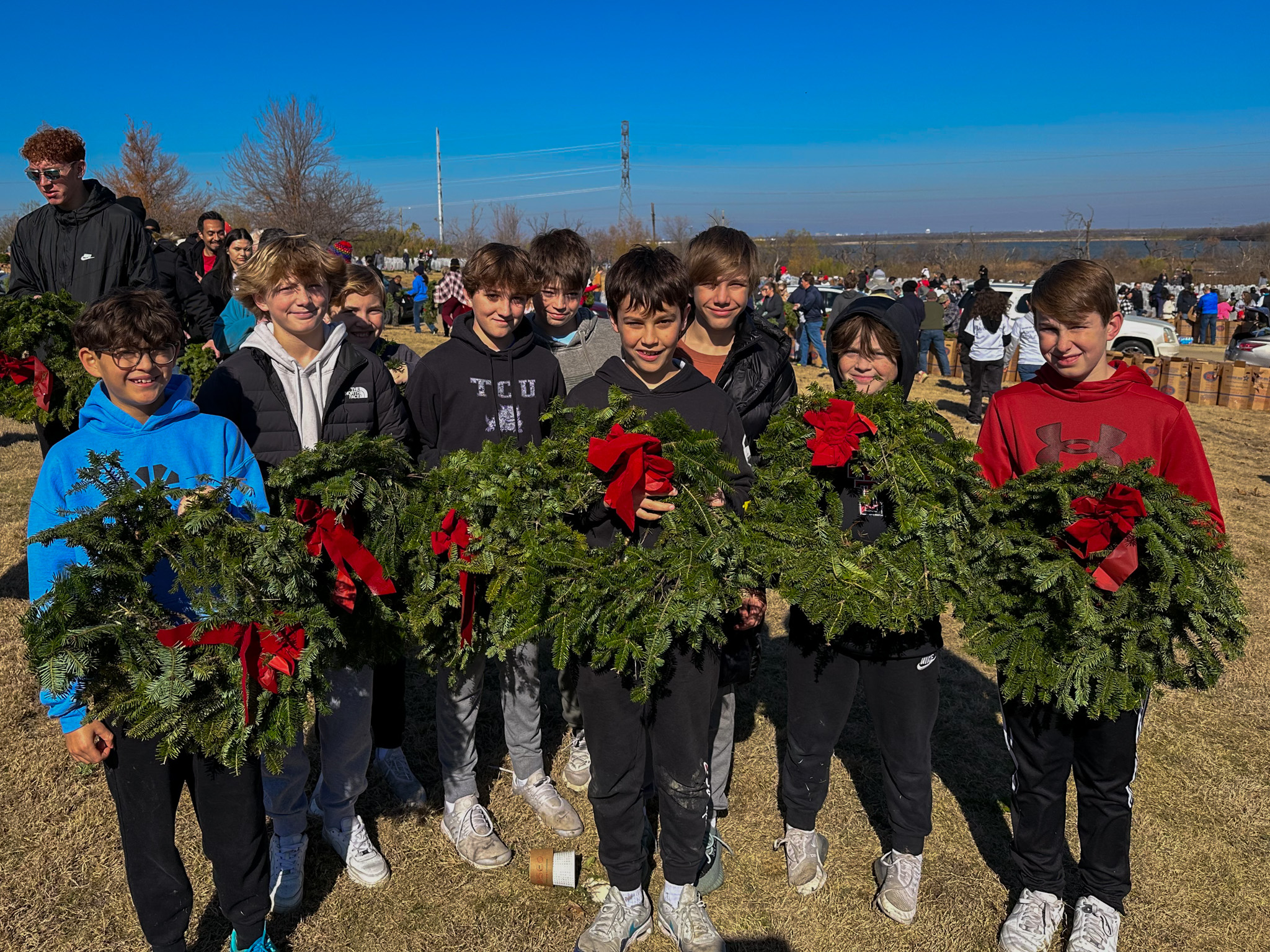 A RAK group honors fallen heroes with Wreaths Across America on Dec. 16, 2023. From left, Nathan Miranda, Austin McGinnis, Hunter Barry, Aiden Barry, Chase Paulsen, Landon Conlon, Luke Pendola, Case Oldham, and Luke Presley.