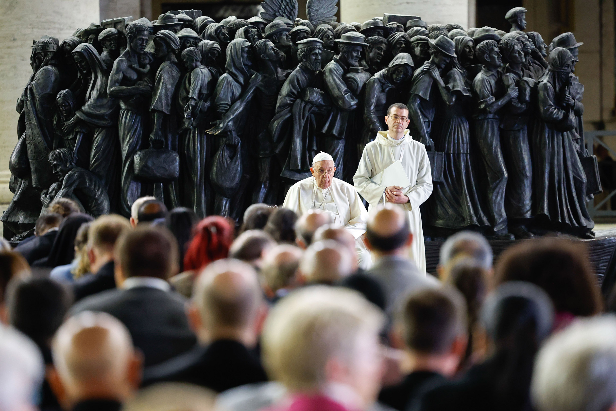Pope Francis shares a moment of silence with members of the assembly of the Synod of Bishops at the end of a prayer for migrants and refugees in St. Peter’s Square at the Vatican Oct. 19, 2023. The service took place around “Angels Unawares,” a sculpture by Canadian Timothy Schmalz, depicting a boat with 140 figures of migrants from various historical periods and various nations. (CNS photo/Lola Gomez)