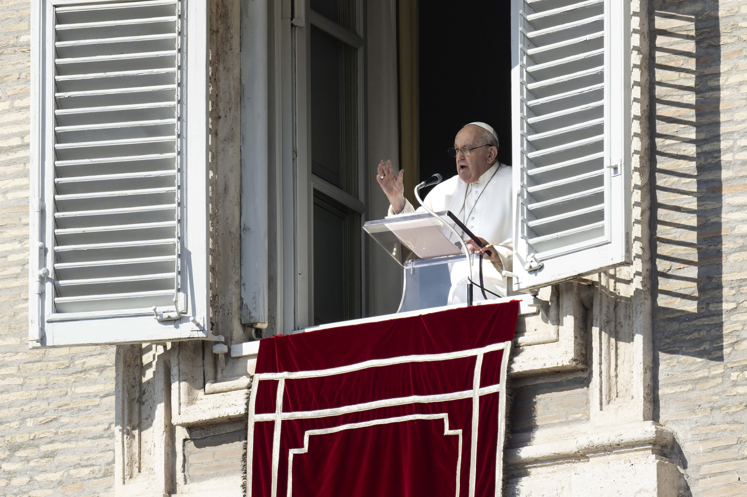 Pope Francis gives his blessing in St. Peter’s Square during the recitation of the Angelus prayer at the Vatican, Feb. 18, 2024. (CNS photo/Vatican Media)