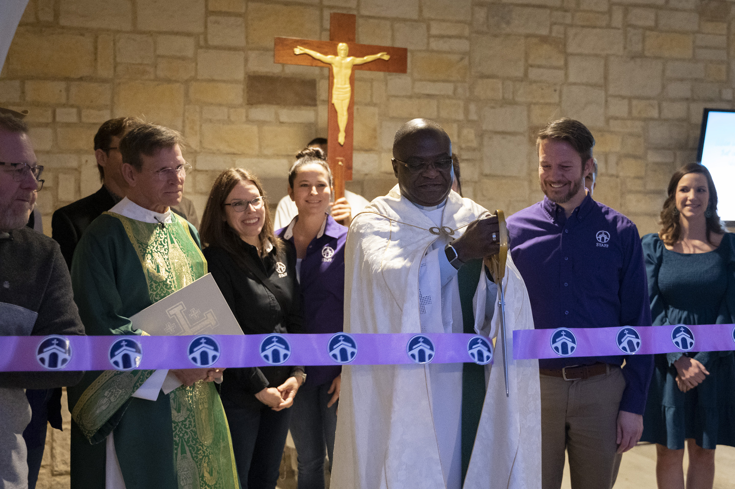 Father Eugene Okoli, pastoral administrator, cuts a ceremonial ribbon for the opening of the St. Gabriel Community Center on Feb. 10 at St. Gabriel the Archangel Catholic Parish in McKinney. The newly renovated center will include a kids zone with a nursery, a youth room, additional classrooms, a common area for parishioners, and a Communion Hall for parish events. (Ben Torres/Special Contributor)