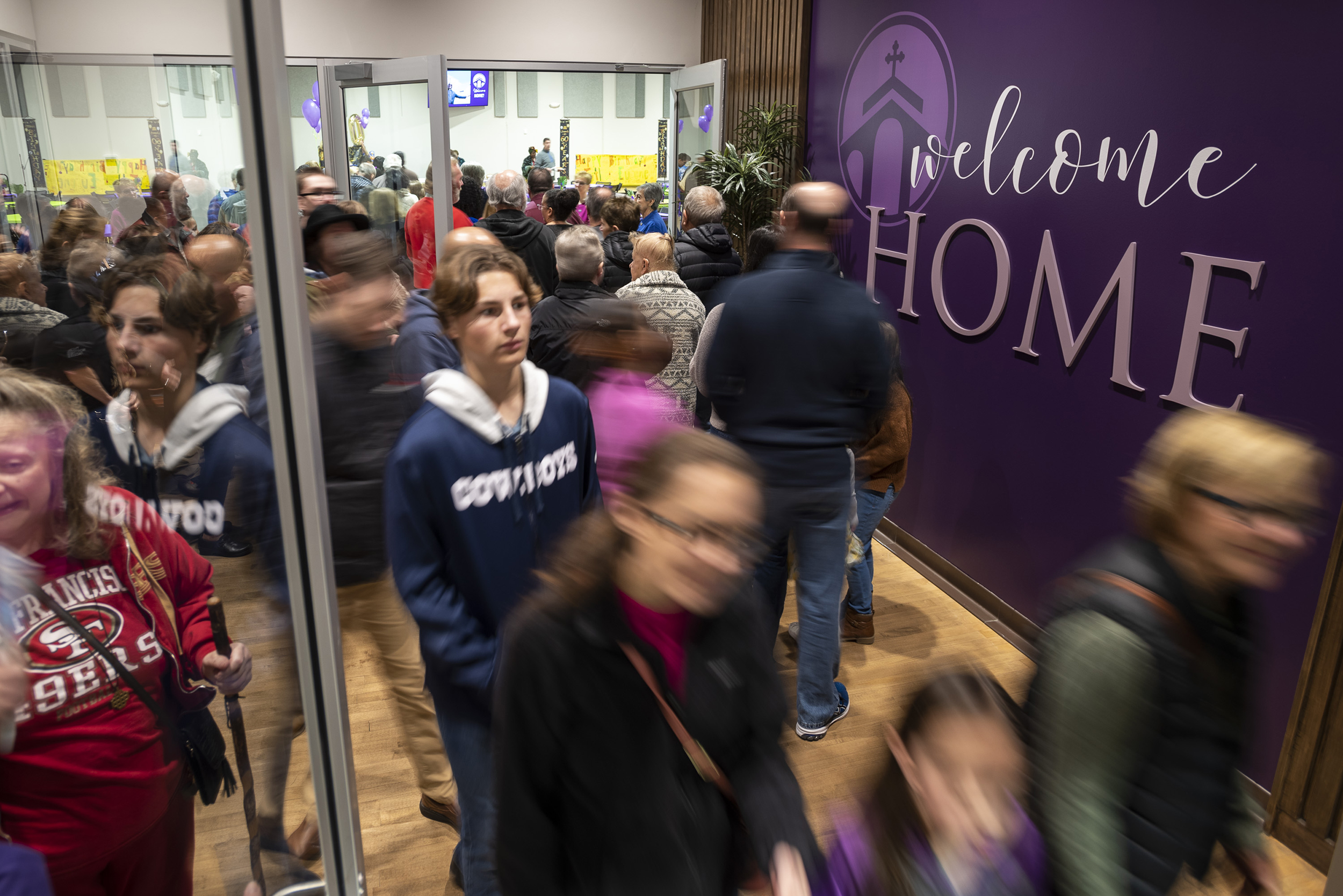 Parishioners enter the renovated St. Gabriel Community Center after a ribbon cutting ceremony on Feb. 10 at St. Gabriel the Archangel Catholic Parish in McKinney. Parish leaders said the newly renovated community center supports the parish’s mission to make disciples, including initiatives for evangelization, adult formation, and family engagement. (Ben Torres/Special Contributor)