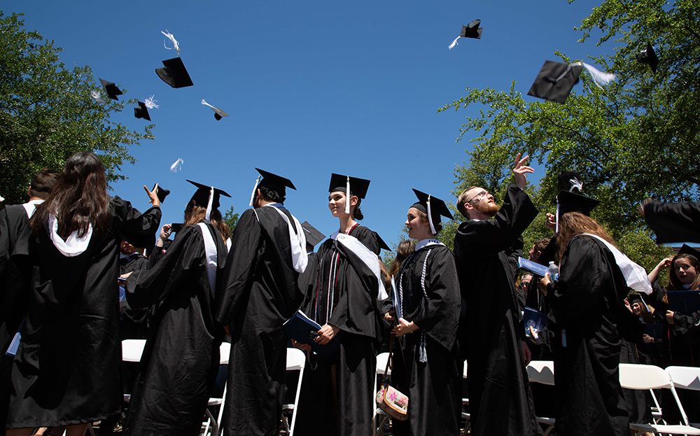 Graduates toss their caps into the air at the University of Dallas graduation in May 2019 in Irving. (Photo by Kevin Bartram)