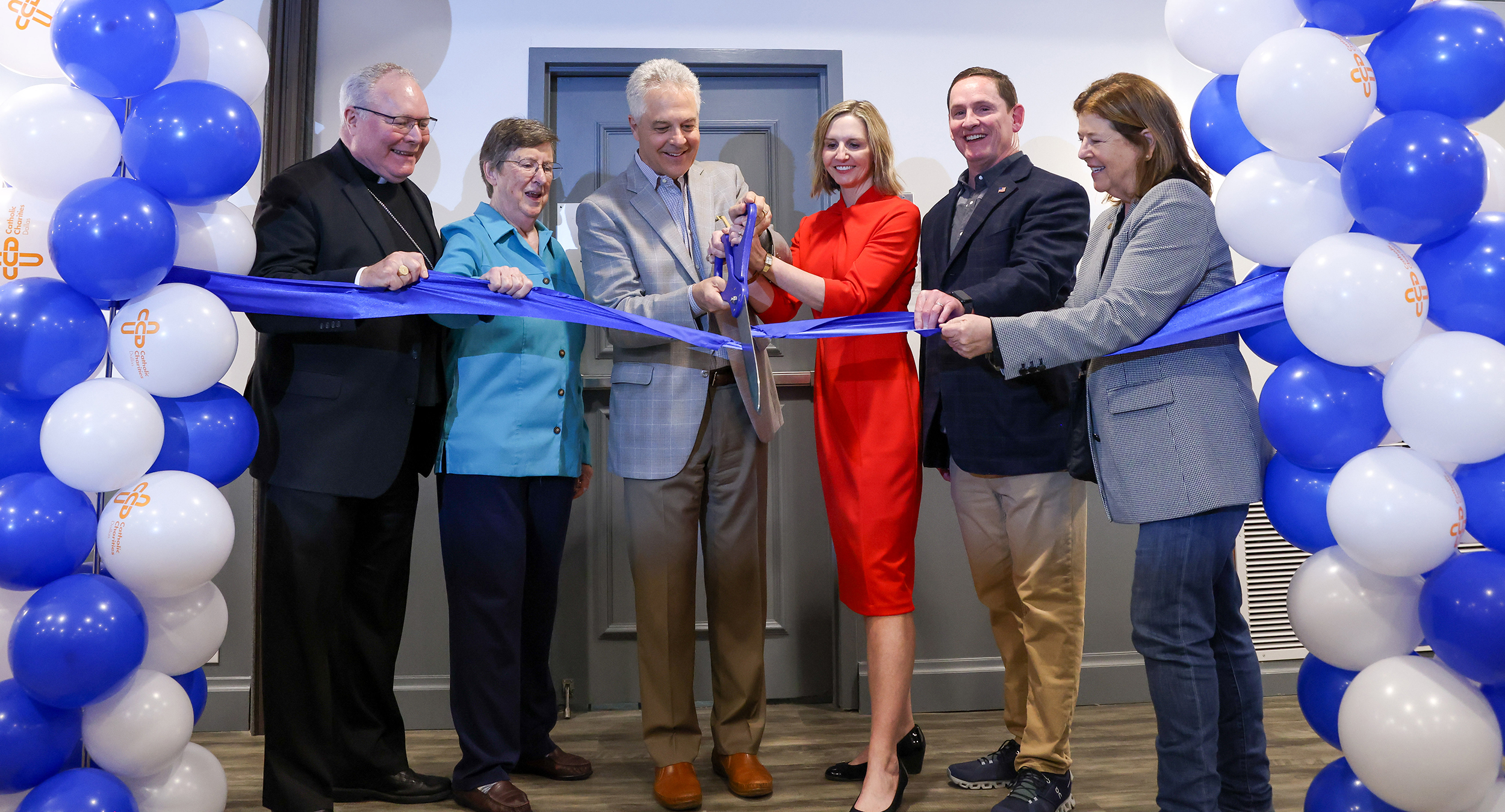 From left, Bishop Edward J. Burns, Sister Mary Anne Owens, SSND, Dave Woodyard, CEO of Catholic Charities Dallas, Anne Readhimer, vice president of community impact at the North Texas Food Bank, Dallas County Judge Clay Jenkins and Dallas City Council member Jaynie Schultz participate in a ribbon-cutting ceremony during the unveiling of a new client-choice food pantry at St. Jude Center-Park Central on March 7 in Dallas. The pantry, a partnership of Catholic Charities Dallas and North Texas Food Bank, will open to the public in April. (Michael Gresham/The Texas Catholic)