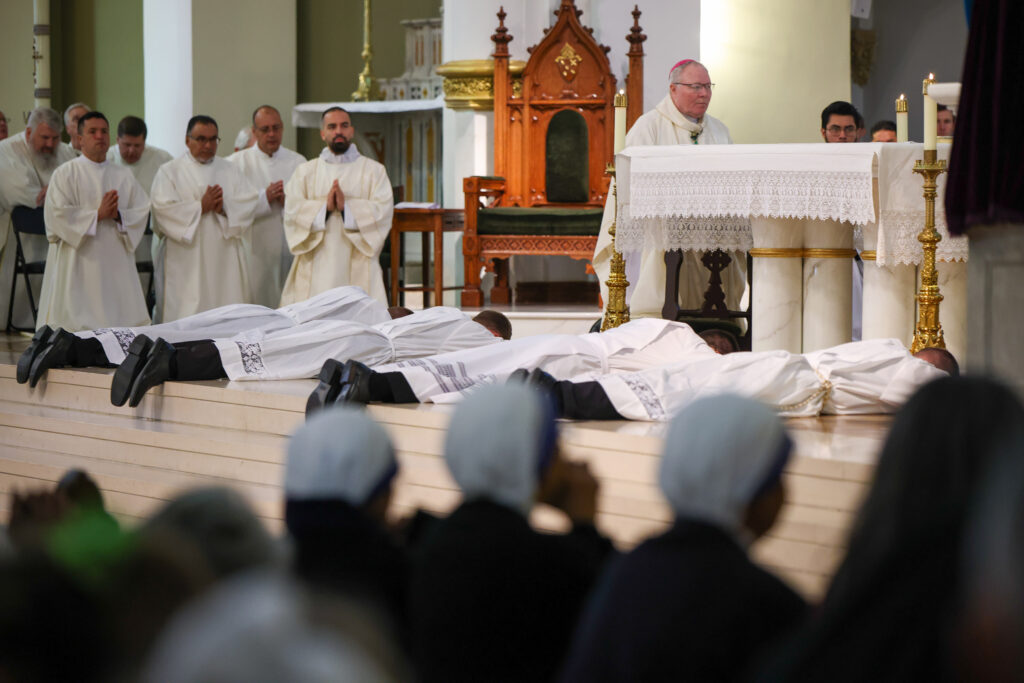 From left, Bryce Baumann, Allen-Michael Muench, David Piquer, and Peter Whitfield lay prostrate before the altar during their Mass of ordination to the diaconate at the National Shrine Cathedral of Our Lady of Guadalupe on March 9. (Michael Gresham/The Texas Catholic)