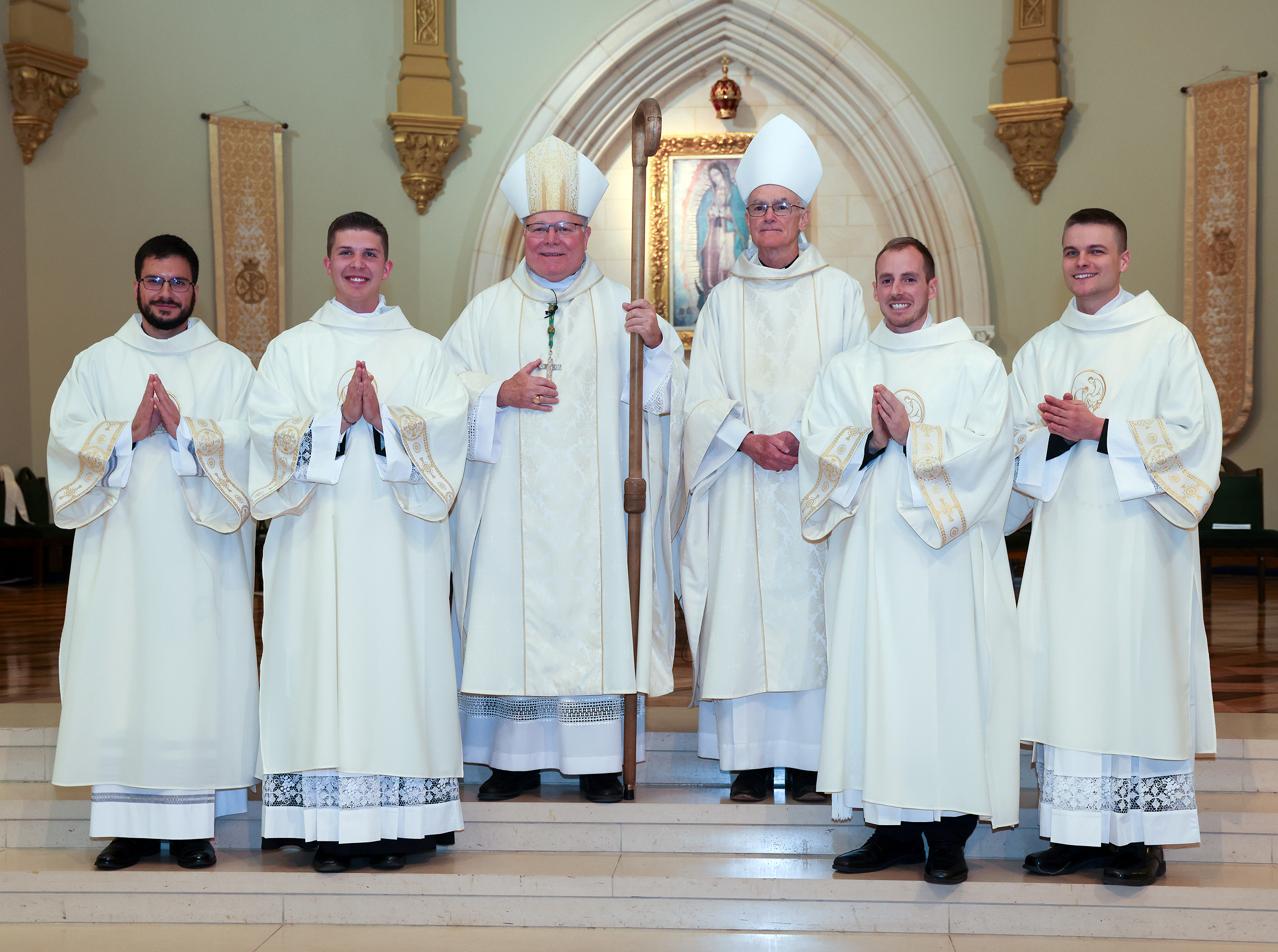 The pews were packed March 9 at the National Shrine Cathedral of Our Lady of Guadalupe as Bishop Edward J. Burns was joined by Auxiliary Bishop Greg Kelly and their brother priests of the Diocese of Dallas for a Mass for the Order of Ordination to the Diaconate of Bryce Baumann, Allen-Michael Muench, David Piquer, and Peter Whitfield.