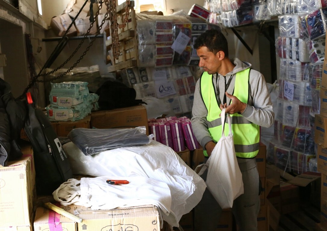 A humanitarian aid worker packs Catholic Relief Services relief supplies in Rafah, in the southern Gaza Strip, for distribution to people displaced in war-torn Gaza. (OSV News photo/Mohammad Al Hout for CRS)