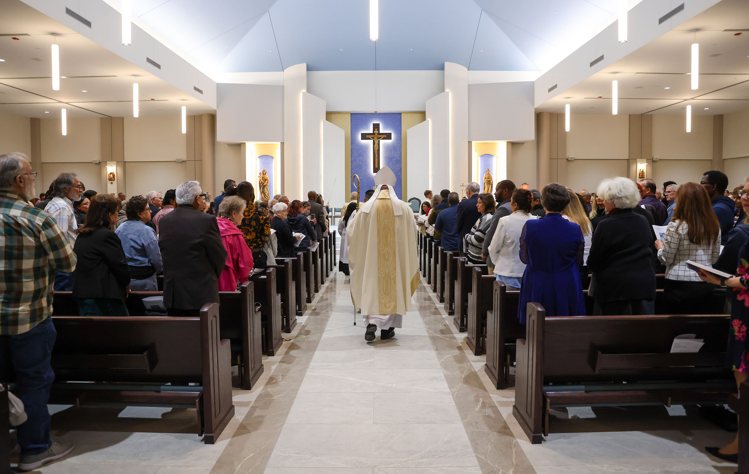 Parishioners stand as Bishop Edward J. Burns processes into the newly renovated sanctuary at Holy Family of Nazareth Catholic Church on March 21 in Irving. The parish recently completed a $2.5 million remodeling project that encompassed the entirety of the interior of the church. (Michael Gresham/The Texas Catholic)
