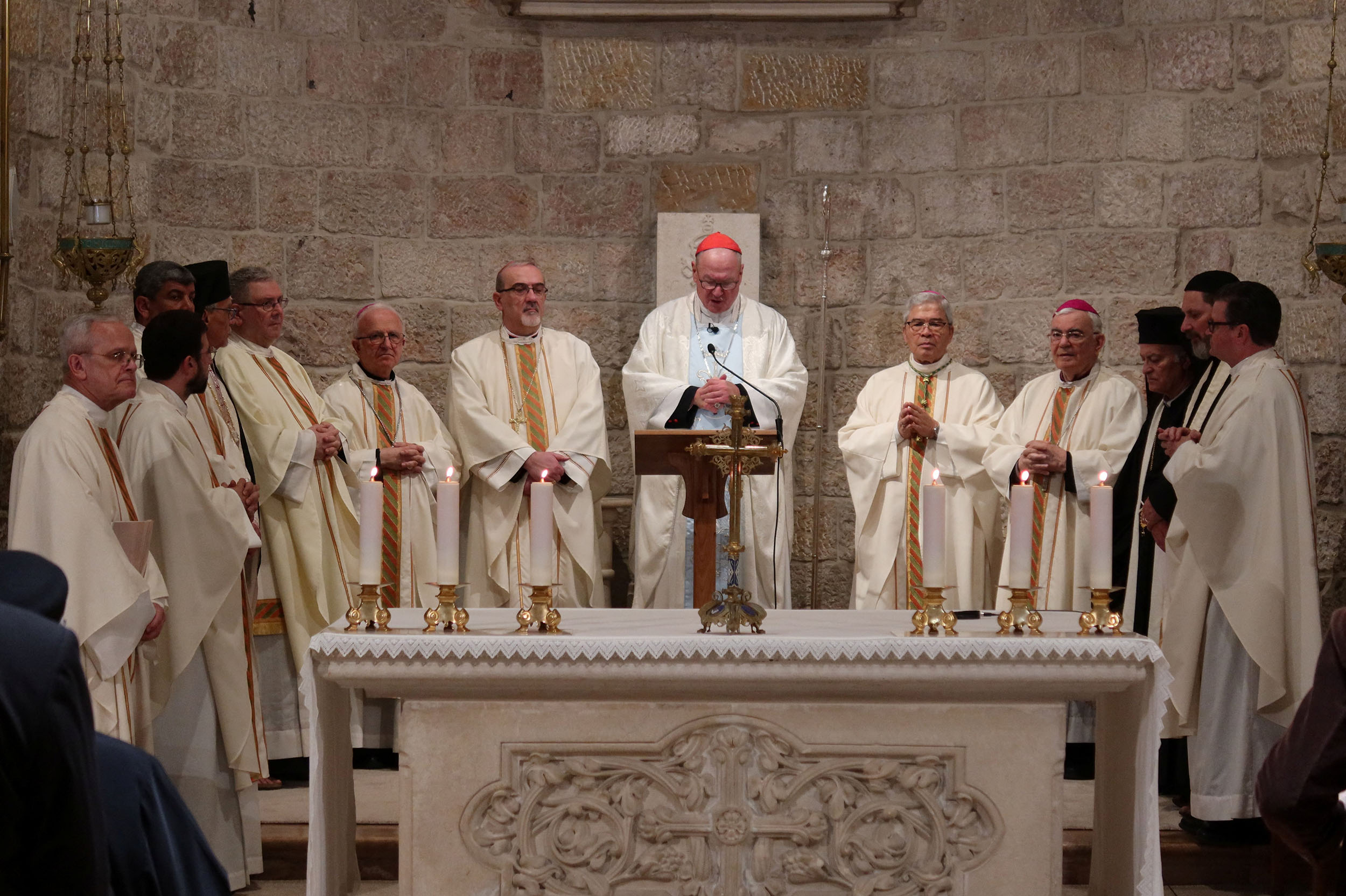 Cardinal Timothy M. Dolan of New York, center, offers Mass at the Our Lady of Peace chapel in the Notre Dame of Jerusalem Center April 13, 2024. The cardinal was reportedly safe in Jerusalem amid Iran’s unprecedented missile and drone attacks on Israel that began later that evening. (OSV News photo/Sinan Abu Mayzer, Reuters)