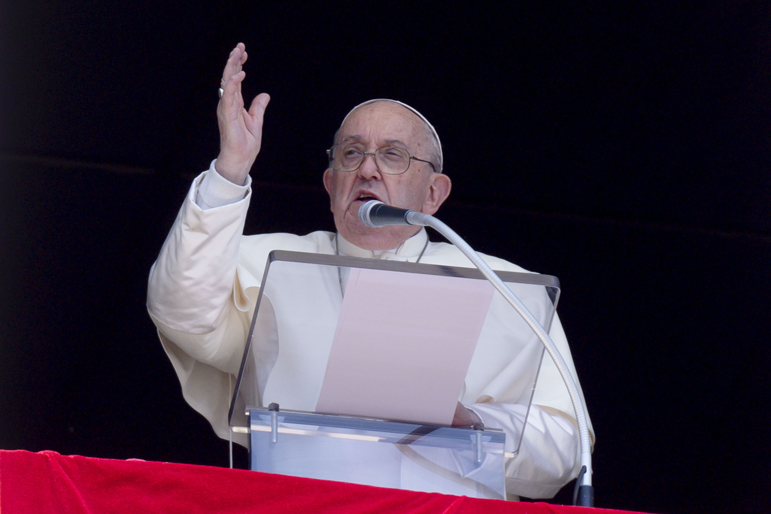 Pope Francis gives his blessing to people gathered in St. Peter’s Square at the Vatican April 14, 2024, for his midday recitation of the “Regina Coeli” prayer. The pope pleaded with nations to exercise restraint and avoid an escalation of violence in the Middle East. (CNS photo/Vatican Media)