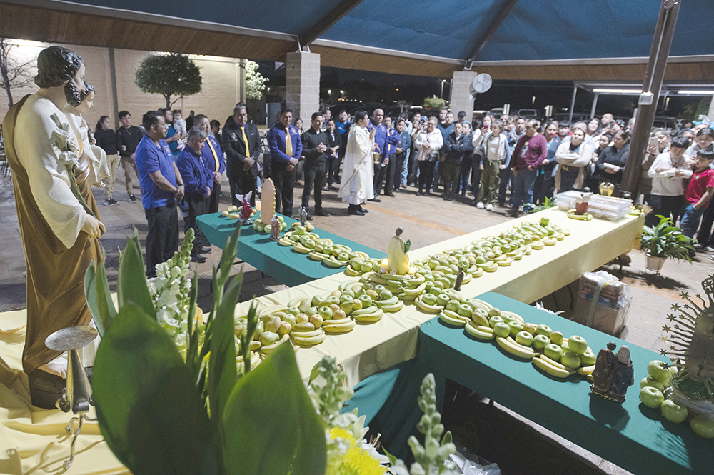 El altar de San José fue adornado con frutas y pan, de acuerdo a una tradición de origen italiano que el padre Juan Torres, vicario de San Juan Diego, aprendió en el estado de Louisiana, como seminarista.