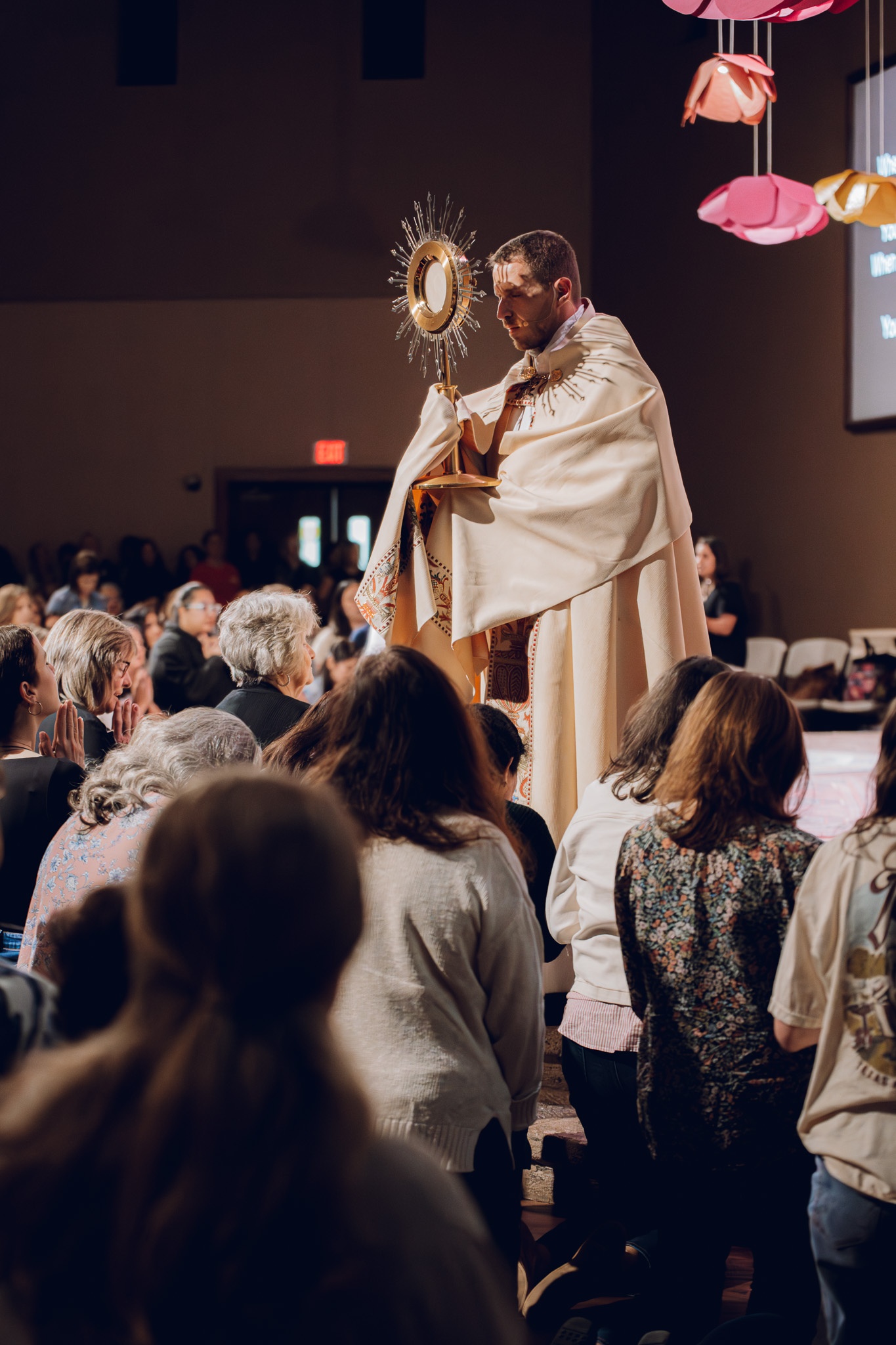 Over the course of the weekend, women at the summit engaged in eucharistic adoration, confession, and worship, as well as community-building opportunities. They gathered to socialize over wine and dessert, lifted their voices in praise, and turned their attention to keynote and breakout speakers.