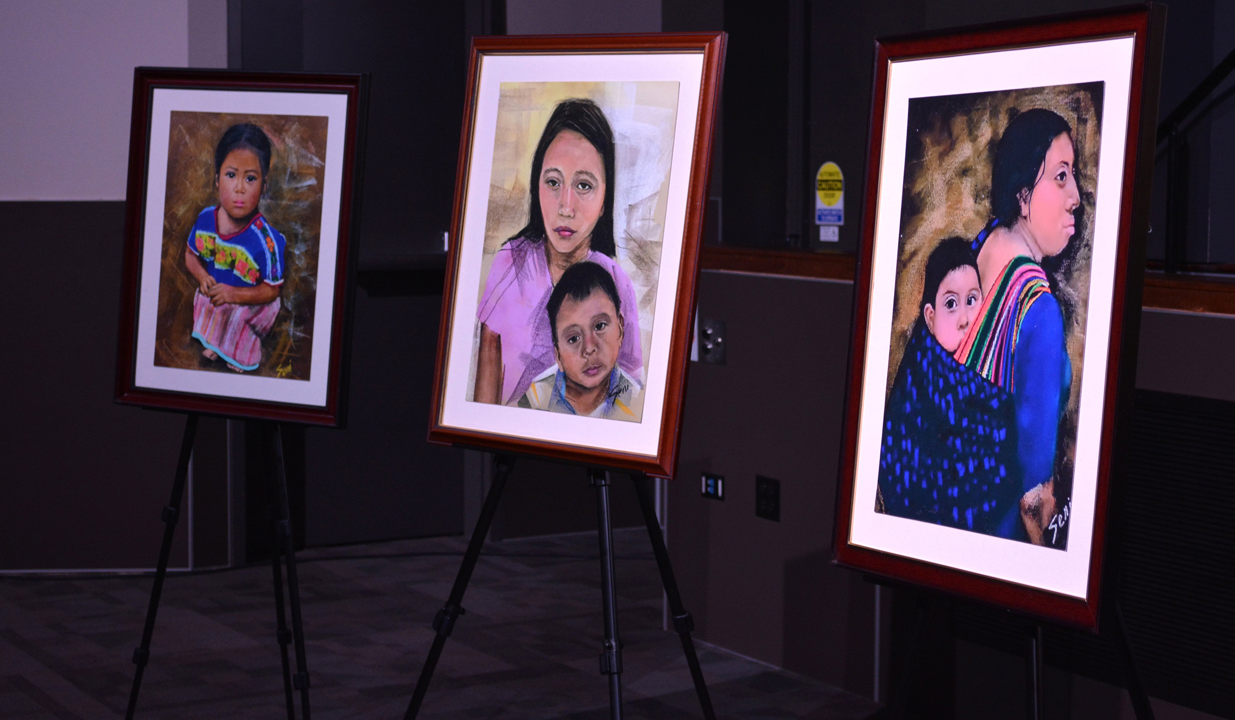 Sister Norma Pimentel, a Missionary of Jesus, stood at a podium at Holy Name Cathedral, positioned between copies of five oil and pastel paintings whose subjects were women and children who sought shelter after being released from detention centers at the border.