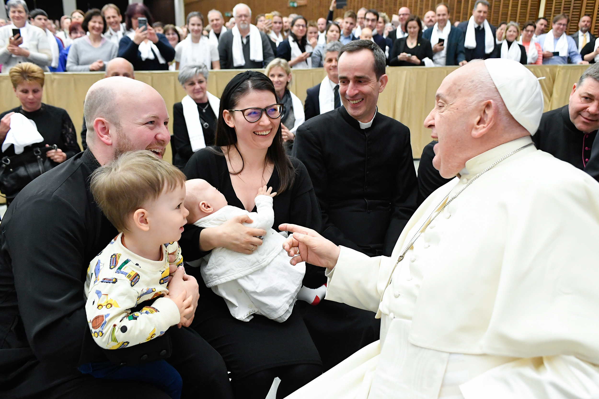 Pope Francis greets a family after an audience with pilgrims from Hungary in the Paul VI Audience Hall at the Vatican April 25, 2024. (CNS photo/Vatican Media)