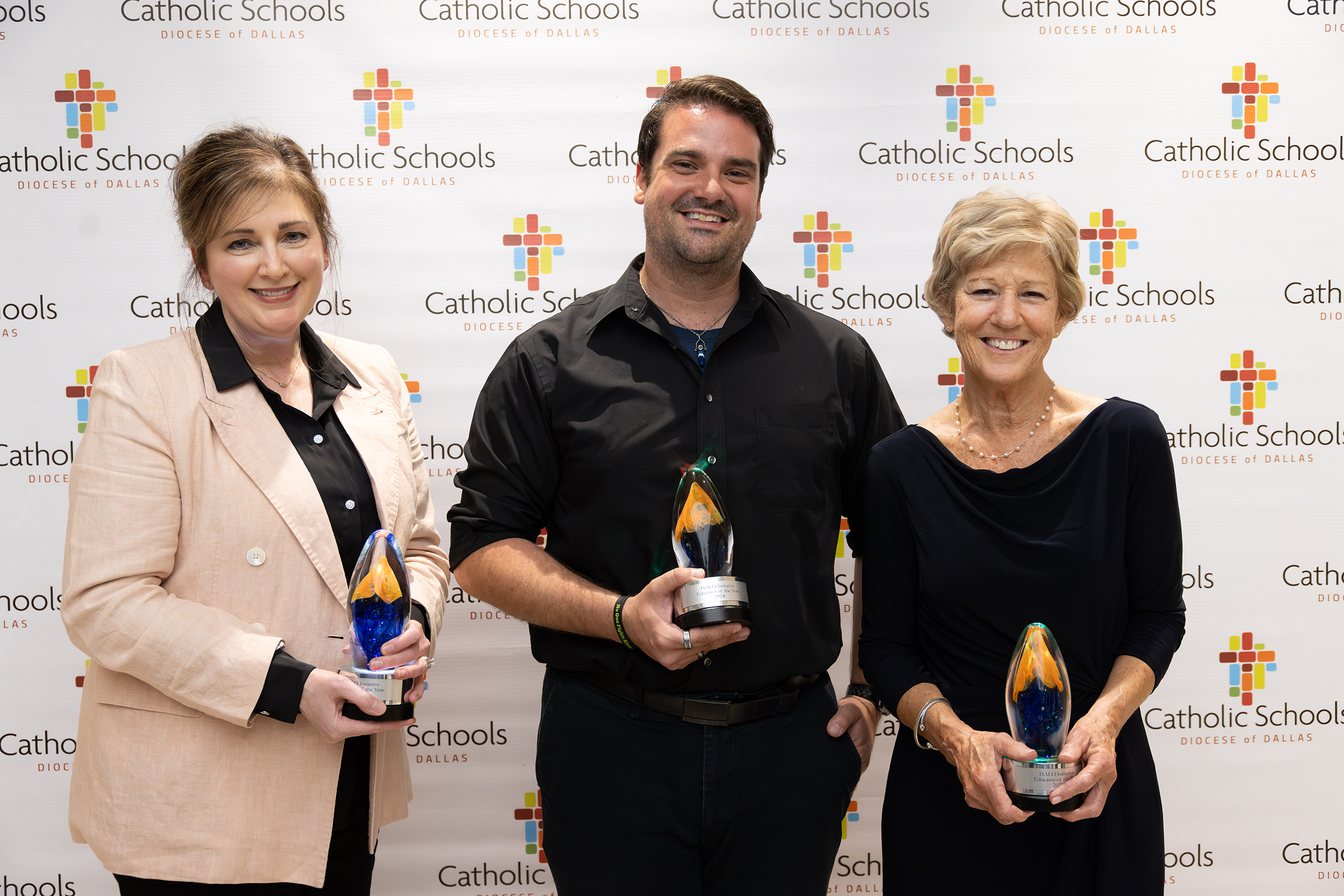 The 2024 Diocese of Dallas HALO Educators of the Year, from left, Melissa Hosea of St. Mark Catholic School, Taylor Coffin of St. Thomas Aquinas Catholic School, and Kathy Bernock of Saint Paul Catholic Classical School, pose with their awards April 26 at the St. Paul the Apostle Catholic Church Parish Center in Richardson. (Michael Gresham/The Texas Catholic)